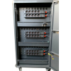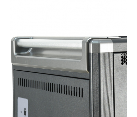 Im Inneren des Schranks sind 30 Einheiten nummeriert und mit Kabelaussparungen aus Gummi und ausziehbaren Schubladen ausgestattet. Die Vorderseite hat eine sichere Tür mit Metallscharnieren, und auf der Rückseite befindet sich ein abschließbares Fach mit Stromunterteilungen. Die Belüftung garantiert eine optimale Luftzirkulation und die umlaufenden Stoßstangen schützen vor Beschädigungen. Die Stromversorgung erfolgt über 2 Stromkabel, und an der Unterseite befinden sich ein Überspannungsschutz und eine Aussparung für die Kabel.