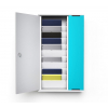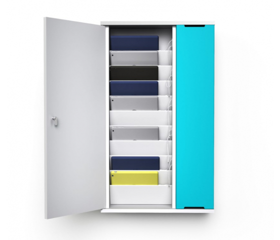 Der Hängeschrank ist mit einem eckigen Einlegeboden aus recyceltem Kunststoff ausgestattet. Diese sind so konzipiert, dass sie die Gehäuse der Geräte schützen und sich leicht anbringen lassen. Der Hängeschrank verfügt über größere Regalabstände, so dass Tablets mit Standard- und dicken Hüllen gelagert werden können.