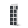 Dieser Schrank bietet 10 Fächer für die sichere Aufbewahrung von persönlichen Gegenständen und verfügt zusätzlich über Steckdosen und USB-Anschlüsse zum Aufladen von Geräten. Das robuste Design und die Lüftungsöffnungen sorgen für eine sichere und effiziente Ladeumgebung.